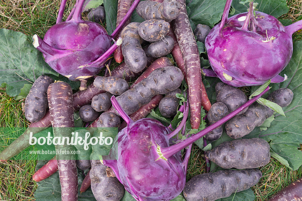 Potatoes (Solanum tuberosum 'Violetta'), carrots (Daucus carota subsp. sativus) and kohlrabi (Brassica oleracea var. gongyloides)