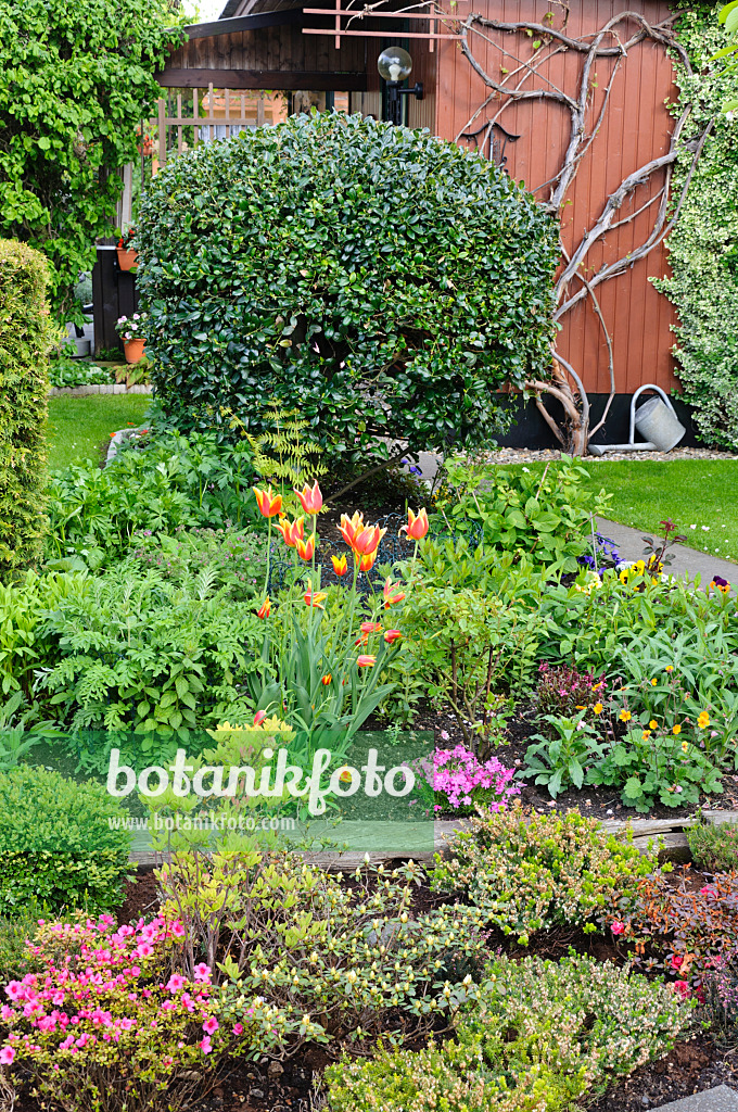 Rhododendrons (Rhododendron) and tulips (Tulipa) in an allotment garden