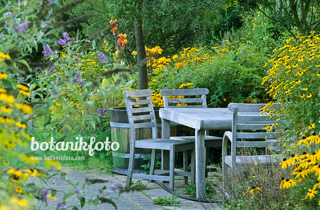 Seating area in a perennial garden
