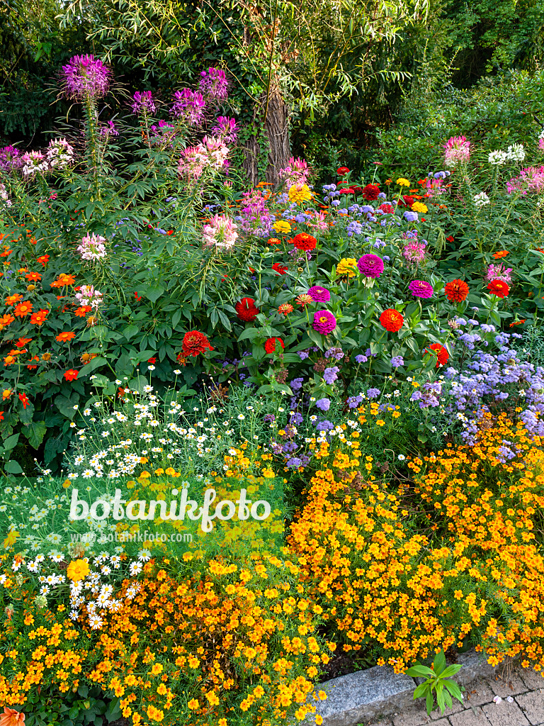 Spider flowers (Tarenaya syn. Cleome), zinnias (Zinnia), floss flowers (Ageratum) and marigolds (Tagetes)