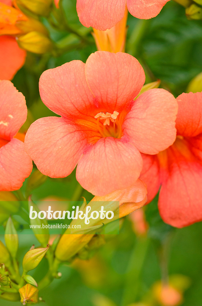 Campsis radicans, commonly known as trumpet vine or trumpet creeper, is a fast-growing, deciduous woody vine native to the southeastern United States. It produces large, trumpet-shaped orange to red flowers that attract hummingbirds and butterflies. The plant thrives in full sun to partial shade and is drought-tolerant once established. It can be invasive due to its aggressive growth and suckering habit. Ideal for trellises, fences, or arbors, but requires regular pruning to control spread. Hardy in USDA zones 4-9.