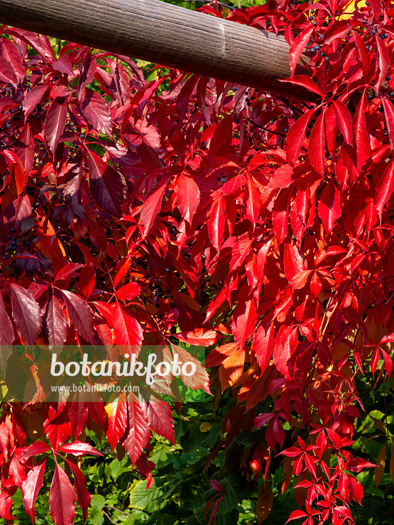 Parthenocissus quinquefolia, commonly known as Virginia creeper, is a fast-growing deciduous vine native to eastern and central North America. It features five-leaflet palmate leaves that turn bright red in fall. The plant produces small greenish flowers and dark blue berries. It clings to surfaces via adhesive tendrils and is often used as an ornamental plant for covering walls or fences. While attractive, it can become invasive if not controlled. The berries are toxic to humans but provide food for birds.