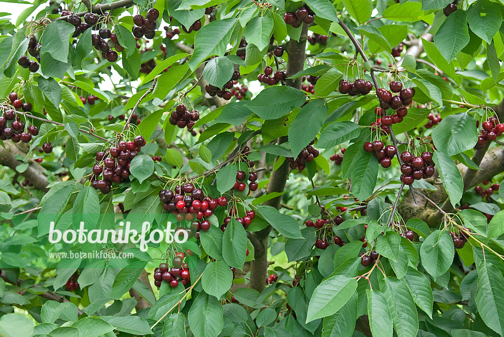 Prunus avium, commonly known as wild cherry or sweet cherry, is a deciduous tree native to Europe, western Asia, and parts of North Africa. It produces white flowers in spring and edible red to dark purple cherries in summer. The tree grows up to 15–32 meters tall and is valued for its fruit and ornamental beauty. It prefers well-drained soil and full sun. The wood is also used in furniture making. Birds often spread its seeds.