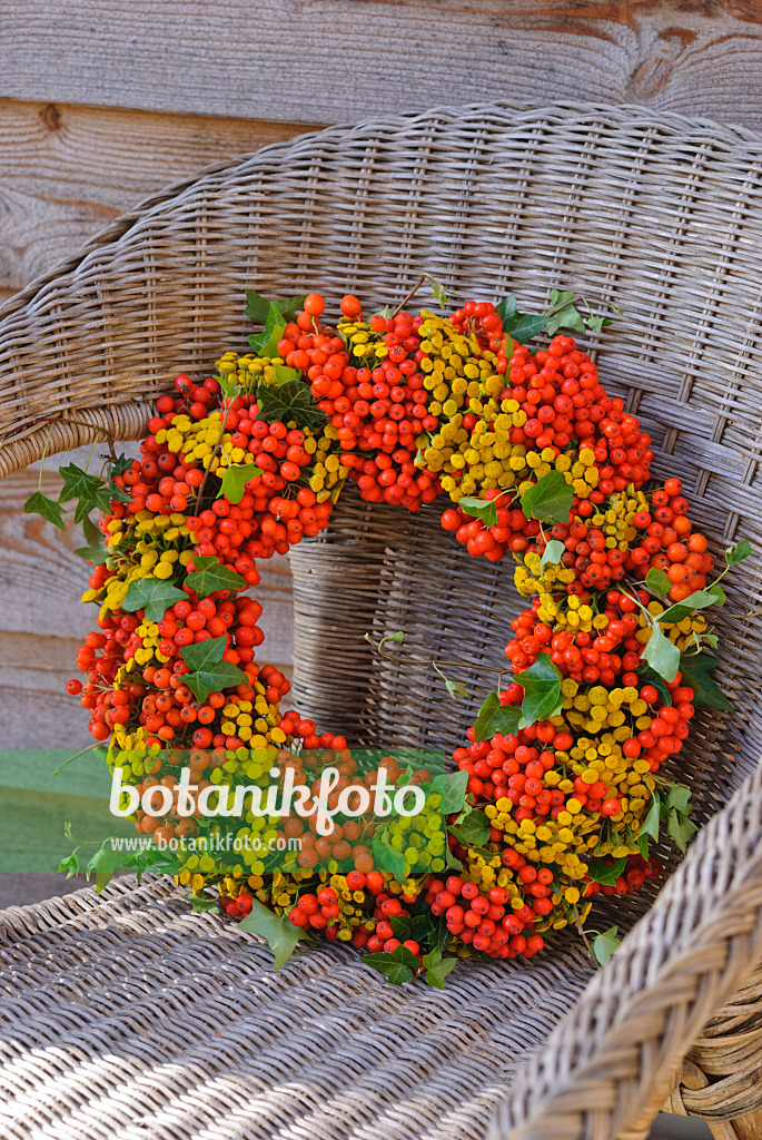 Wreath made of rowan (Sorbus aucuparia), common tansy (Tanacetum vulgare) and common ivy (Hedera helix)
