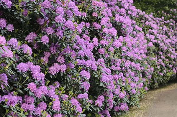 Catawba rhododendron (Rhododendron catawbiense 'Roseum Elegans') and common boxwood (Buxus sempervirens)