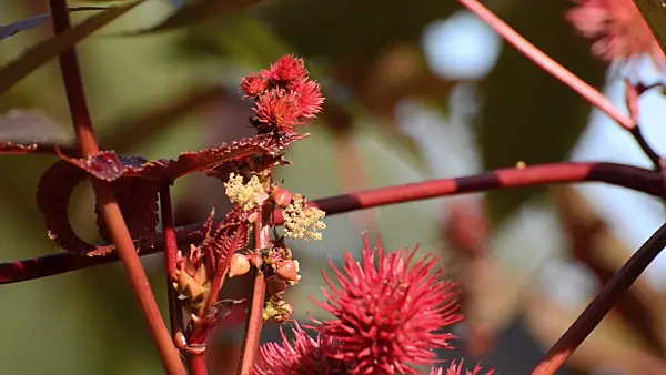Castor oil plant (Ricinus communis), love lies bleeding (Amaranthus caudatus) and rose (Rosa)