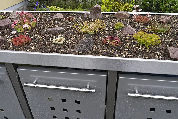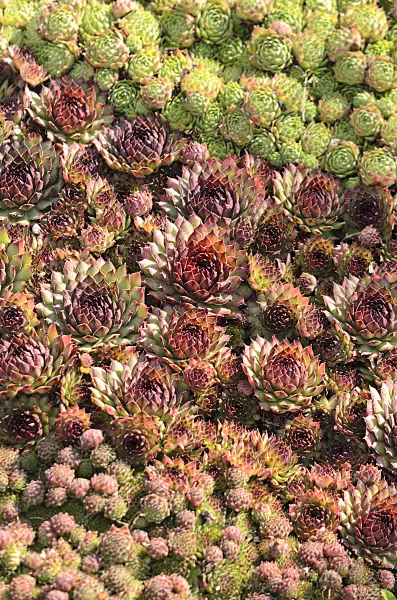 Houseleeks (Sempervivum) and stonecrops (Sedum) in a flower tub