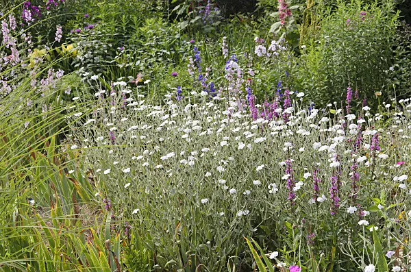 Crown pink (Lychnis coronaria 'Alba' syn. Silene coronaria 'Alba') and loosestrife (Lythrum)