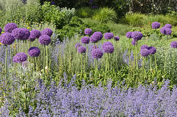 Giant allium (Allium Globemaster) and cranesbill (Geranium x magnificum)