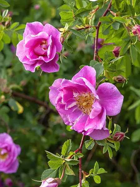 Rosier gallique (Rosa Charles de Mills), lis des steppes (Eremurus) et géranium (Geranium)