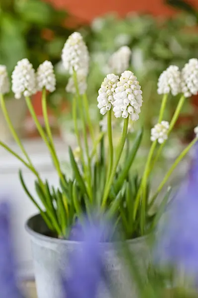 Pensée à corne (Viola cornuta), muscari d'Arménie (Muscari armeniacum 'White Magic') et aubriète (Aubrieta deltoidea)