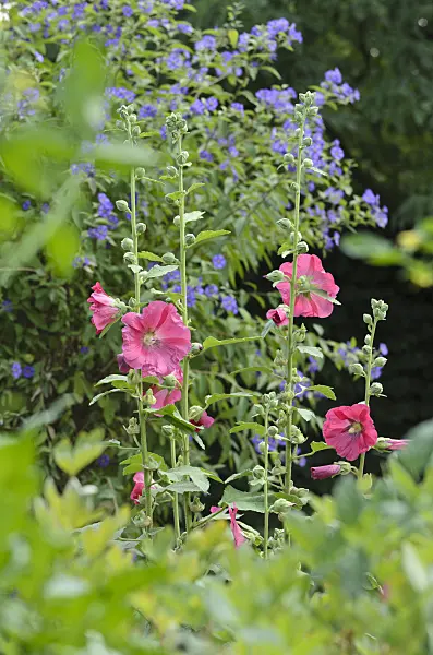 Passeroses (Alcea rosea), molènes (Verbascum) et dauphinelles (Delphinium)