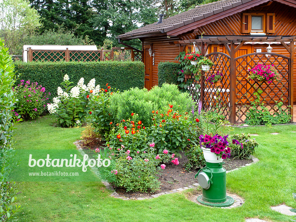 Abri de jardin en bois et parterres de fleurs dans un jardin familial