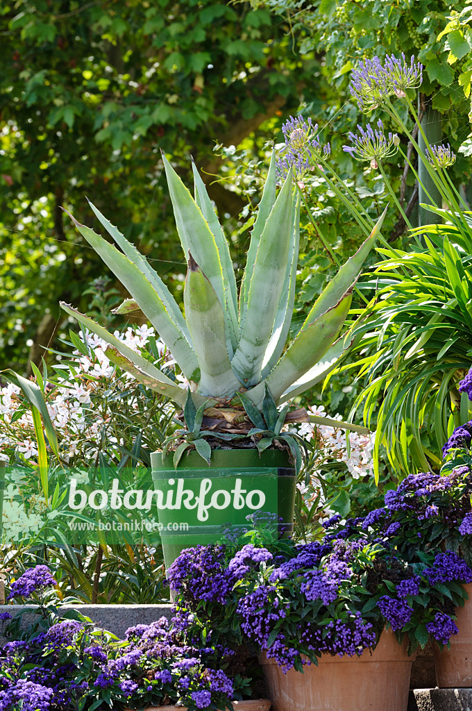 Agave (Agave), agapanthe africaine (Agapanthus) et héliotrope (Heliotropium)