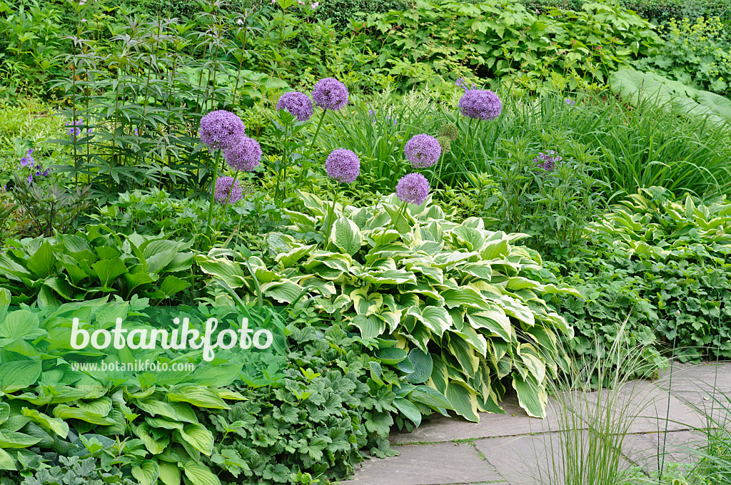 Ail géant (Allium Globemaster) et funkia (Hosta)