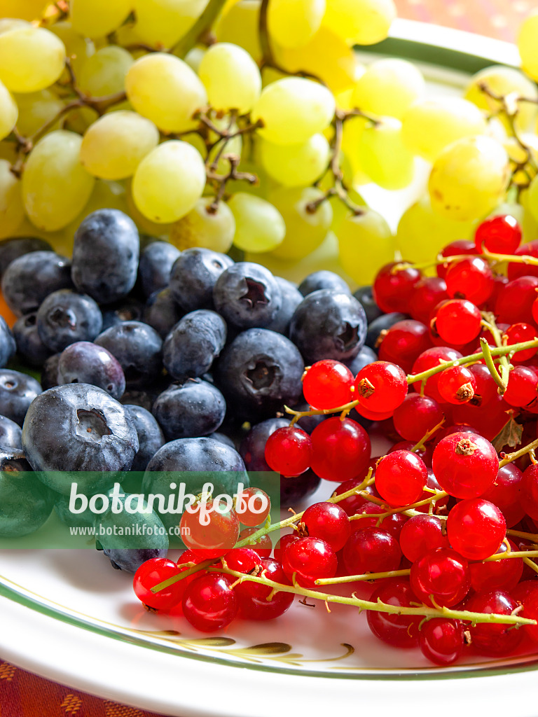 Airelle en corymbe (Vaccinium corymbosum), groseillier à grappes (Ribes rubrum) et vigne cultivée (Vitis vinifera)