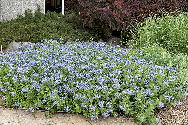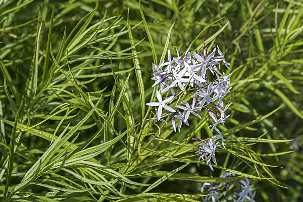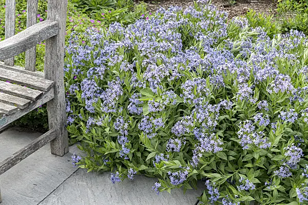 Amsonie (Amsonia hubrichtii) et sauge des prés (Salvia pratensis 'Pink Delight') sur une ligne ferroviaire aérienne désaffectée, High Line, New York, États-Unis