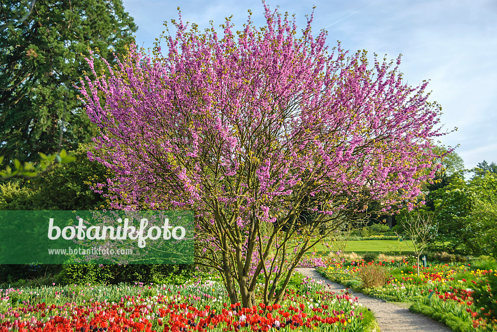 Arbre de Judée (Cercis siliquastrum) et tulipes (Tulipa)