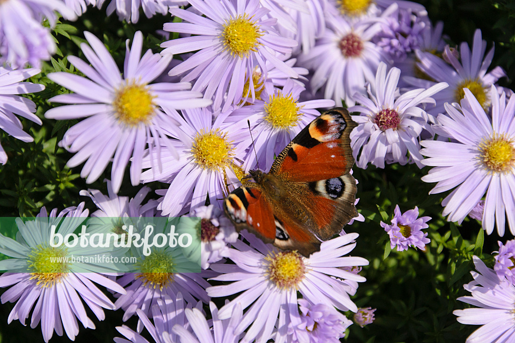 Aster nain d'automne (Aster dumosus 'Silberblaukissen') et paon du jour (Inachis io)