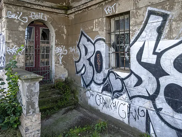 Bambou (Fargesia nitida 'Jiuzhaigou 1') dans un jardin devant une vieille maison avec un mur de briques