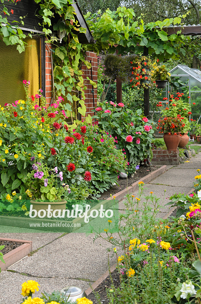 Belles de nuit (Mirabilis jalapa) et dahlias (Dahlia) dans un jardin familial