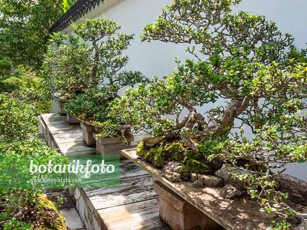 Bonsaïs sur des socles en bois devant un mur de maison blanche dans un jardin de bonsaïs