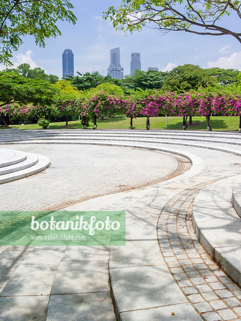 Bougainvillées (Bougainvillea) derrière une grande place avec des marches en pierre, Sundial Plaza, Marina City Park, Singapour