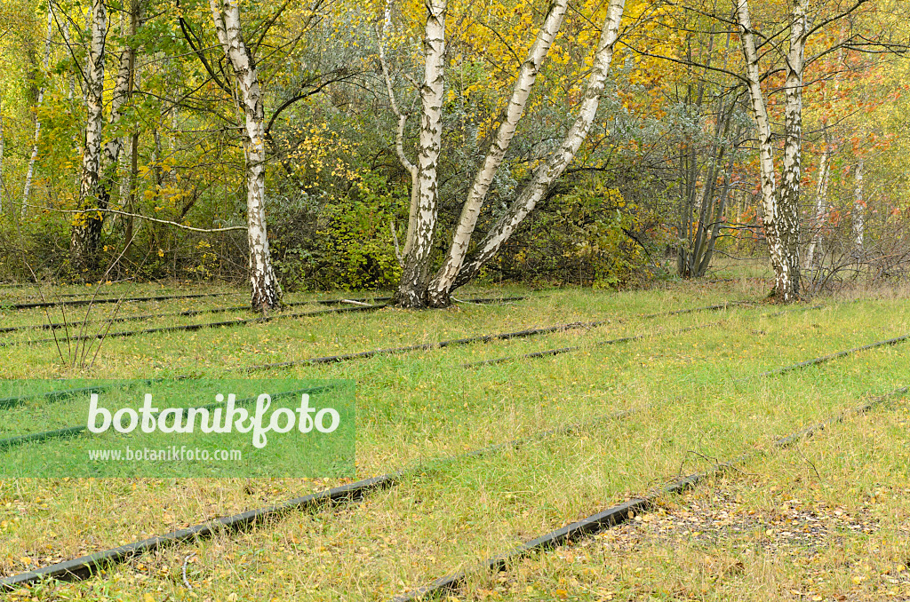 Bouleaux verruqueux (Betula pendula) entre les rails d'un dépôt de marchandises abandonné, réserve naturelle de Schöneberger Südgelände, Berlin, Allemagne