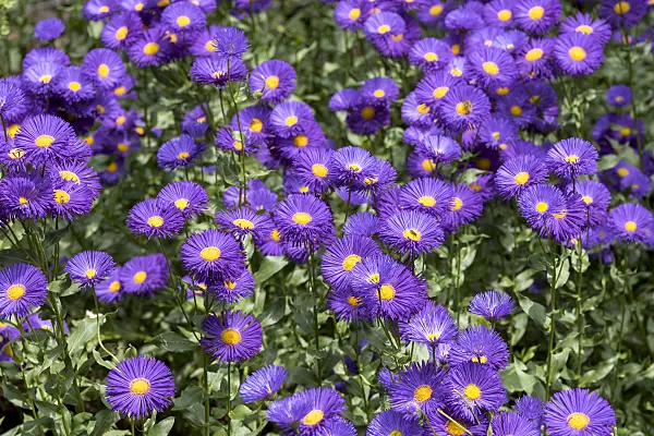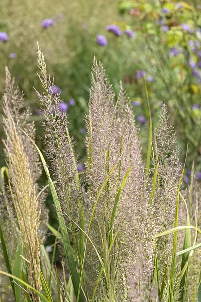 Calamagrostide à feuilles de roseau (Calamagrostis arundinacea var. brachytricha syn. Achnatherum brachytricha), vergerette de Karvinski (Erigeron karvinskianus) et bruyère (Calluna vulgaris) dans des pots