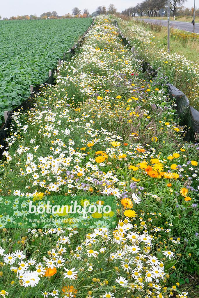 Camomille sauvage (Matricaria recutita syn. Matricaria chamomilla), souci officinal (Calendula officinalis) et phacélie (Phacelia)