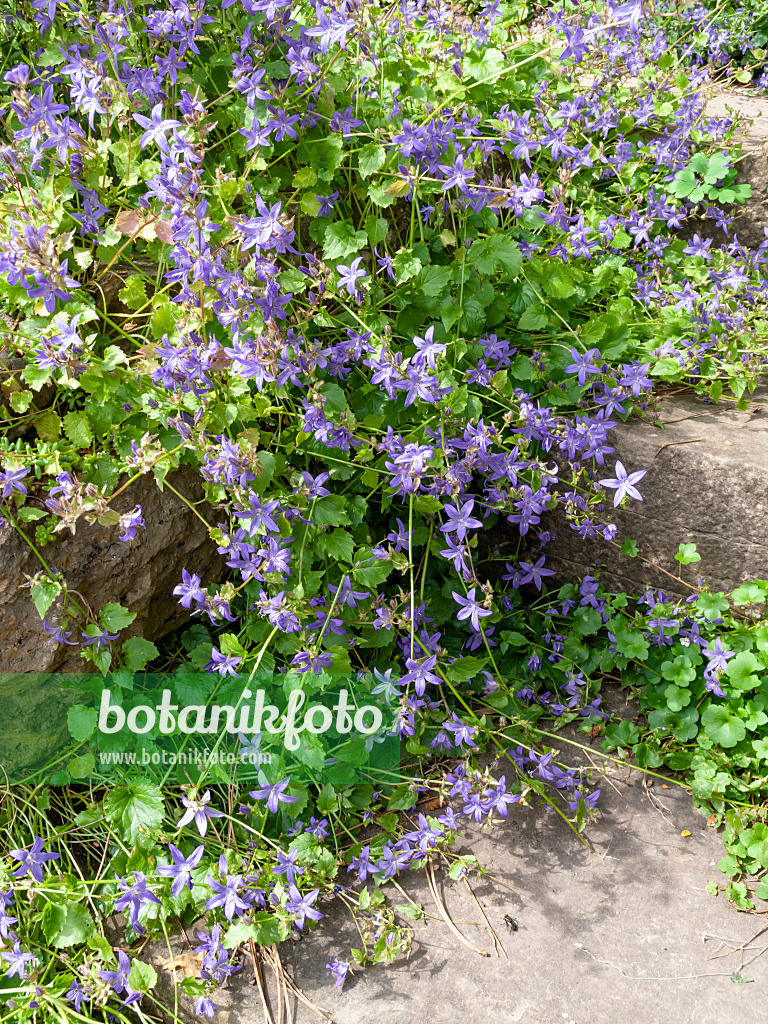 La Campanula poscharskyana, ou campanule des murs, est une plante vivace tapissante originaire des Balkans. Elle produit des fleurs en forme d'étoile, violettes ou bleues, de mai à septembre. Résistante et facile à cultiver, elle préfère le soleil ou la mi-ombre et un sol bien drainé. Idéale pour les rocailles, bordures ou murets.