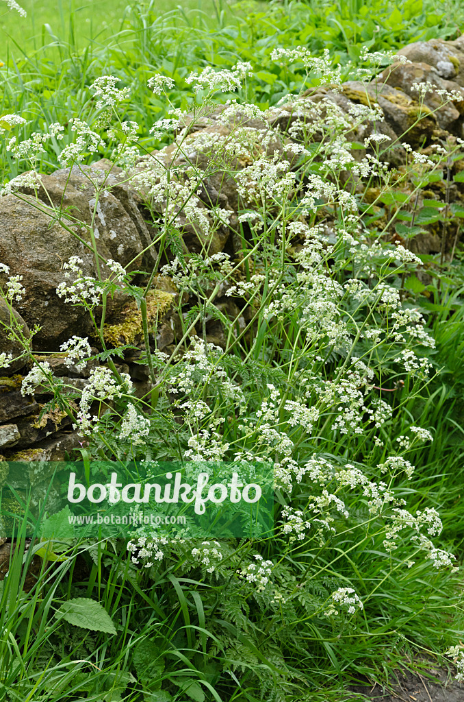 Cerfeuil des bois (Anthriscus sylvestris) à un mur de pierre moussu