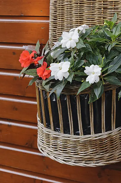 Chaises en fer blanc sous un pommier devant un mur rouge