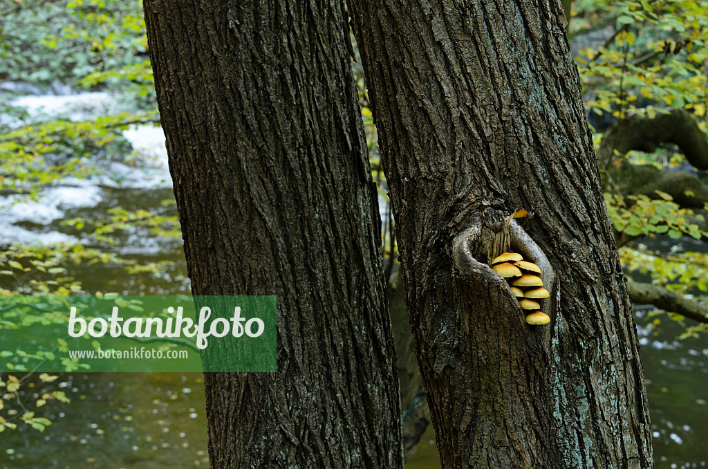 Charme commun (Carpinus betulus) avec des champignons au bord d'un ruisseau de montagne