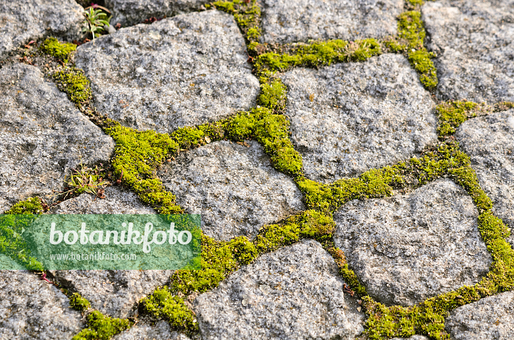 Chemin de jardin en pavés avec de la mousse dans les joints