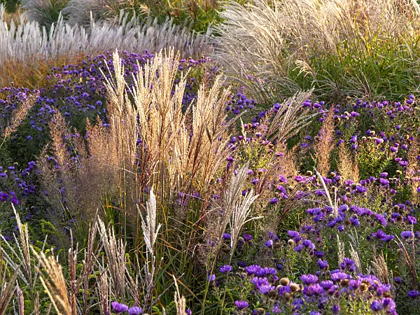 Chrysanthèmes (Chrysanthemum), asters (Aster) et roseau de Chine (Miscanthus sinensis)
