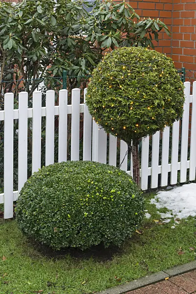 Clôture blanche en palissade avec des arcs incurvés devant un jardin de devant avec une végétation tropicale