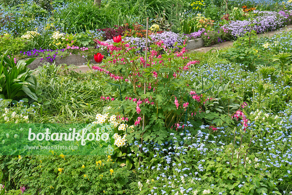 Cœur de Marie (Lamprocapnos spectabilis syn. Dicentra spectabilis), primevères (Primula) et Myosotis