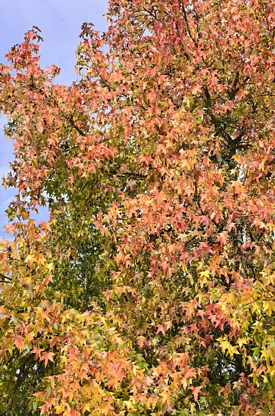 Le Liquidambar styraciflua, aussi appelé copalme d'Amérique, est un arbre ornemental originaire d'Amérique du Nord. Il est apprécié pour son feuillage caduc aux couleurs automnales spectaculaires (rouge, orange, pourpre). Son écorce est profondément fissurée et il produit des fruits en forme de boules épineuses. Il peut atteindre 20 à 30 mètres de haut et préfère les sols frais et humides.