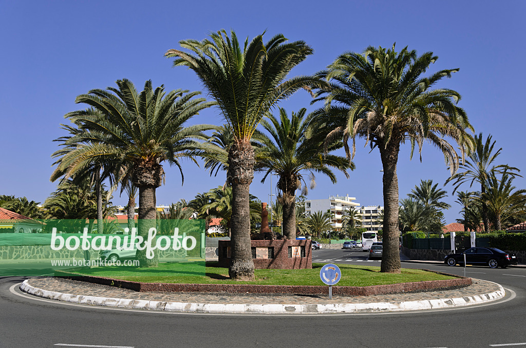 Dattiers des Canaries (Phoenix canariensis) sur un rond-point, Maspalomas, Gran Canaria, Espagne