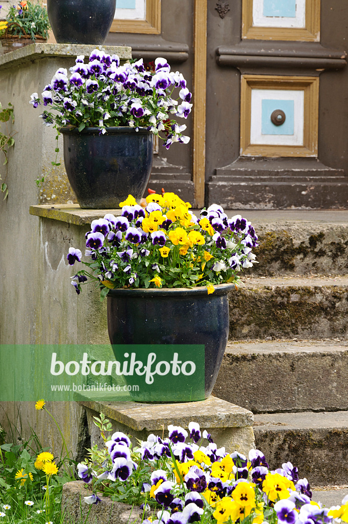 Entrée de maison avec des violettes dans des bacs