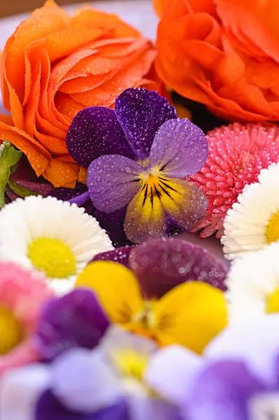 Épicéa blanc (Picea glauca 'Conica') et violettes (Viola)