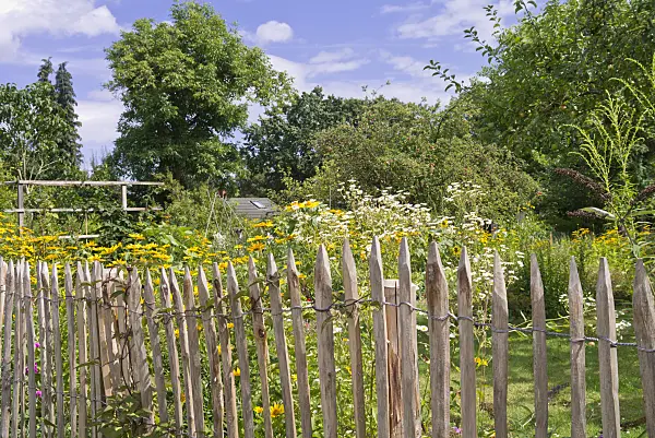 Épouvantail sous la forme d'une tête de chat en bois noir accrochée à un bâton dans un massif de jardin
