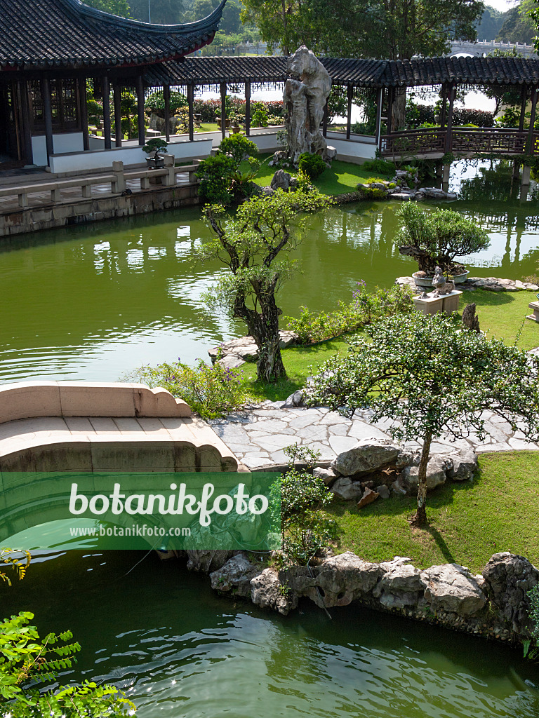 Étang, pont en pierre et maison au toit en forme de pagode, jardin de bonsaïs, Singapour