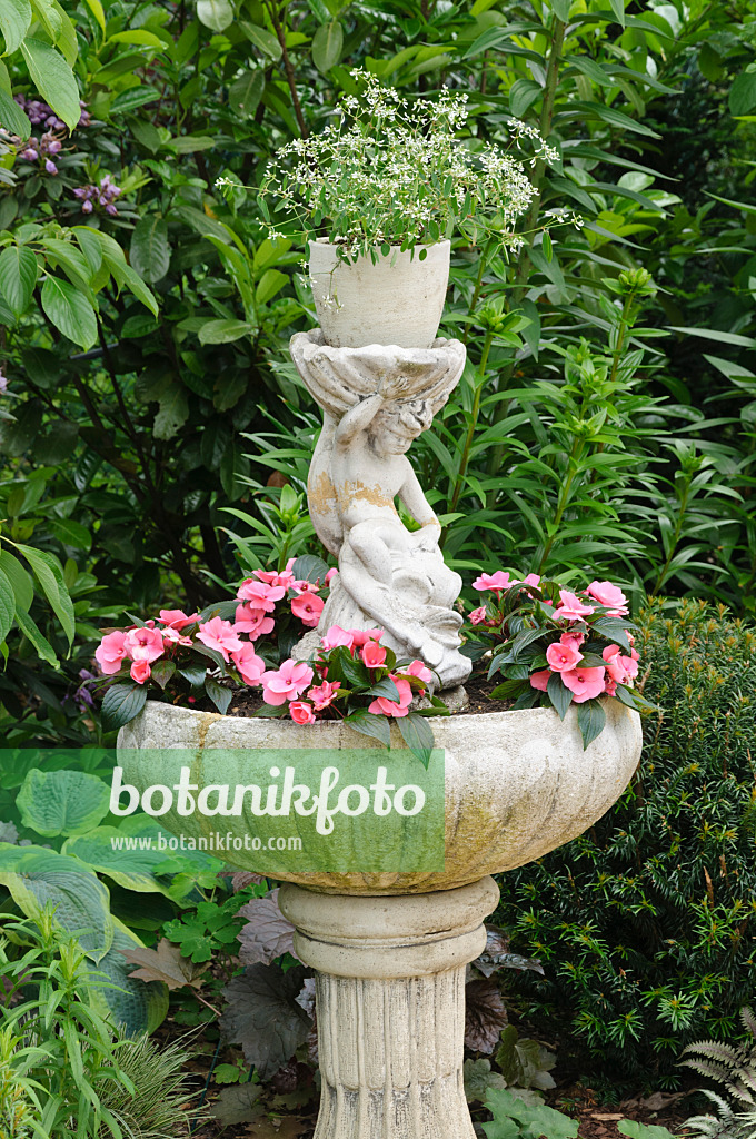 Euphorbe (Euphorbia hypericifolia 'Diamond Frost') et balsamine (Impatiens walleriana) dans une fontaine