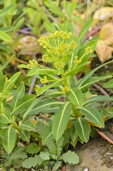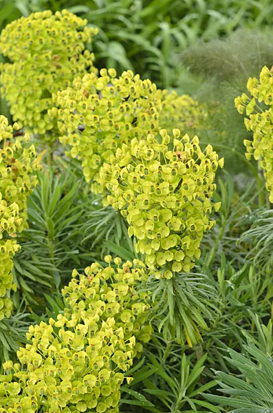 Euphorbe polychrome (Euphorbia polychroma syn. Euphorbia epithymoides) et Myosotis dans un jardin de plantes vivaces printanier