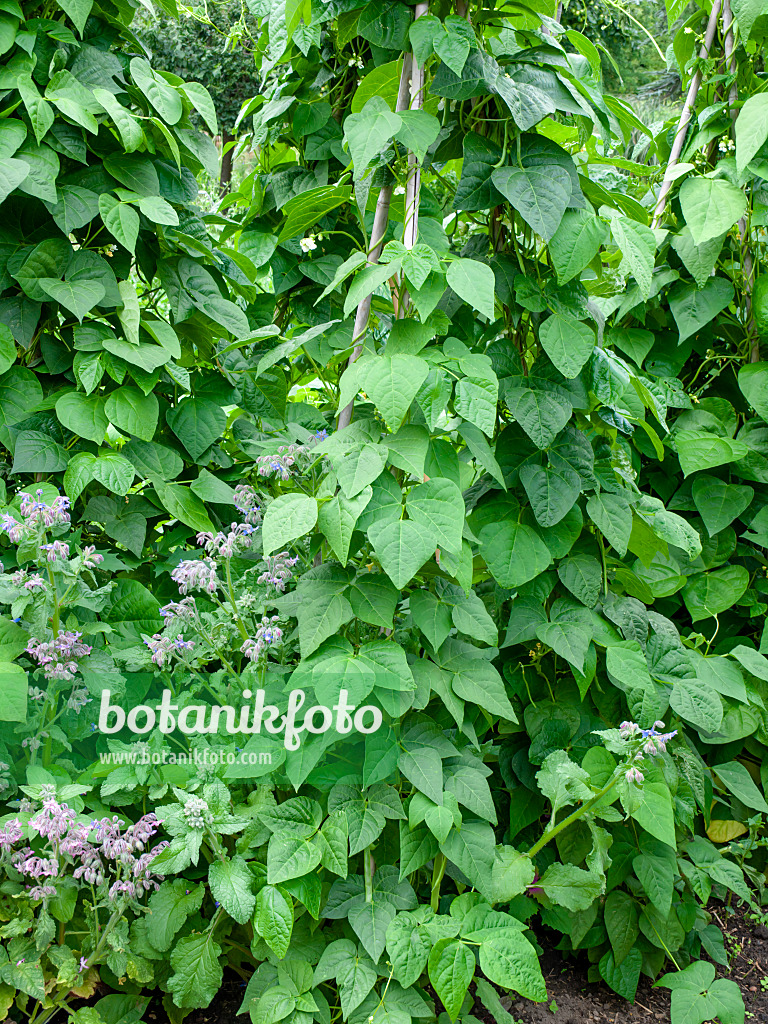 Haricot commun (Phaseolus vulgaris var. vulgaris 'Blauhilde') et bourrache officinale (Borago officinalis)