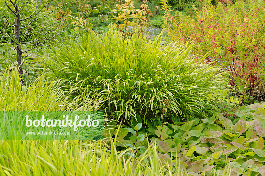 Hakonechloa macra, aussi appelée herbe du Japon, est une graminée vivace originaire des montagnes du Japon. Elle forme des touffes denses de feuilles fines et arquées, vertes à jaunes selon les variétés. Elle préfère les sols frais et ombragés, idéale pour les jardins de style japonais. Sa croissance est lente et elle atteint environ 40 cm de haut. Résistante au froid, elle offre un beau spectacle en automne avec ses feuilles qui prennent des teintes orangées.