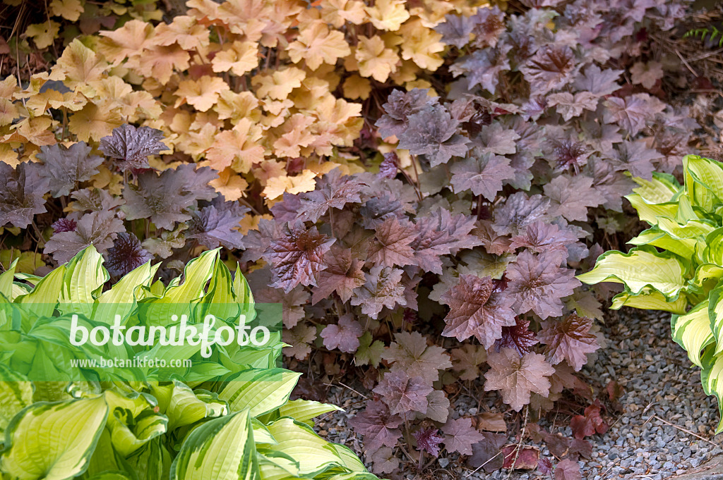 Heuchère (Heuchera micrantha 'Palace Purple' et Heuchera villosa 'Caramel') et funkia (Hosta Gold Standard)