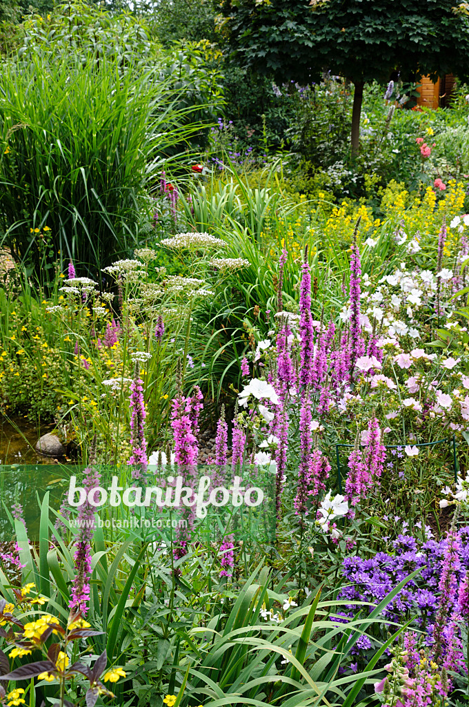 Jardin de plantes vivaces avec salicaire commune (Lythrum salicaria) et mauves (Malva)